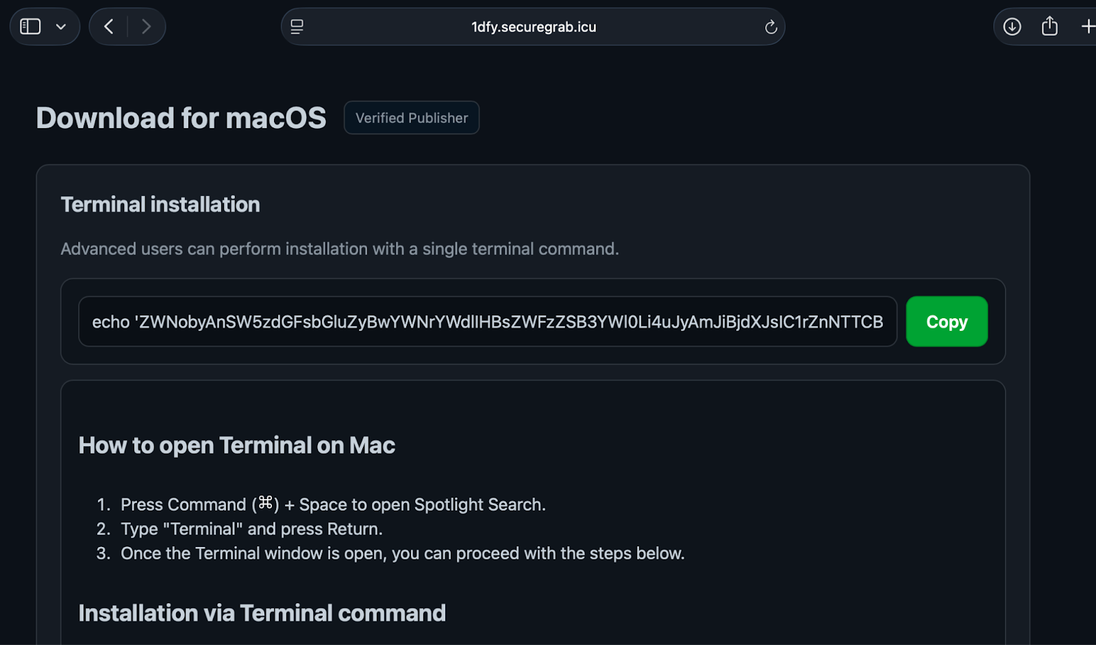 The malware attempts to run harmful scripts immediately when executed. It also uses a 'ClickFix' style attack via browser pop-up to trick users into manually copying and pasting malicious code, potentially re-infecting the system even after an initial compromise. Researchers believe the potential of this is a loader as a service (a malware distribution service sold to other criminals) and is part of the broader Pay-Per-Install (where attackers earn money for each successful infection) ecosystem targeting macOS users.